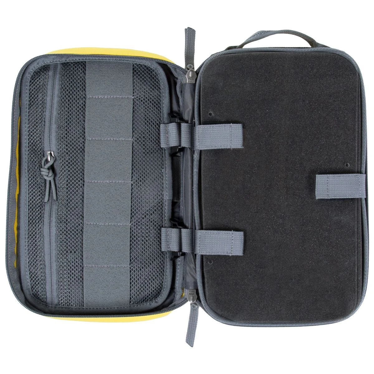 The pouch comes with book style opening with durable two-way YKK zippers with oversized zip pulls and durable top handle. The spacious interior on the left side includes multiple elasticated loops, sleeve pocket, webbing loop with a snap button and a zipped mesh pocket. The interior on the right side comes with a pick and pluck foam that allows customising the layout of all items, protected with a clear window featuring a snap-lock closure. The stiffened construction with one hard wall prevents medical kit from damages, and the bright yellow colour helps to find or describe the kit easily.